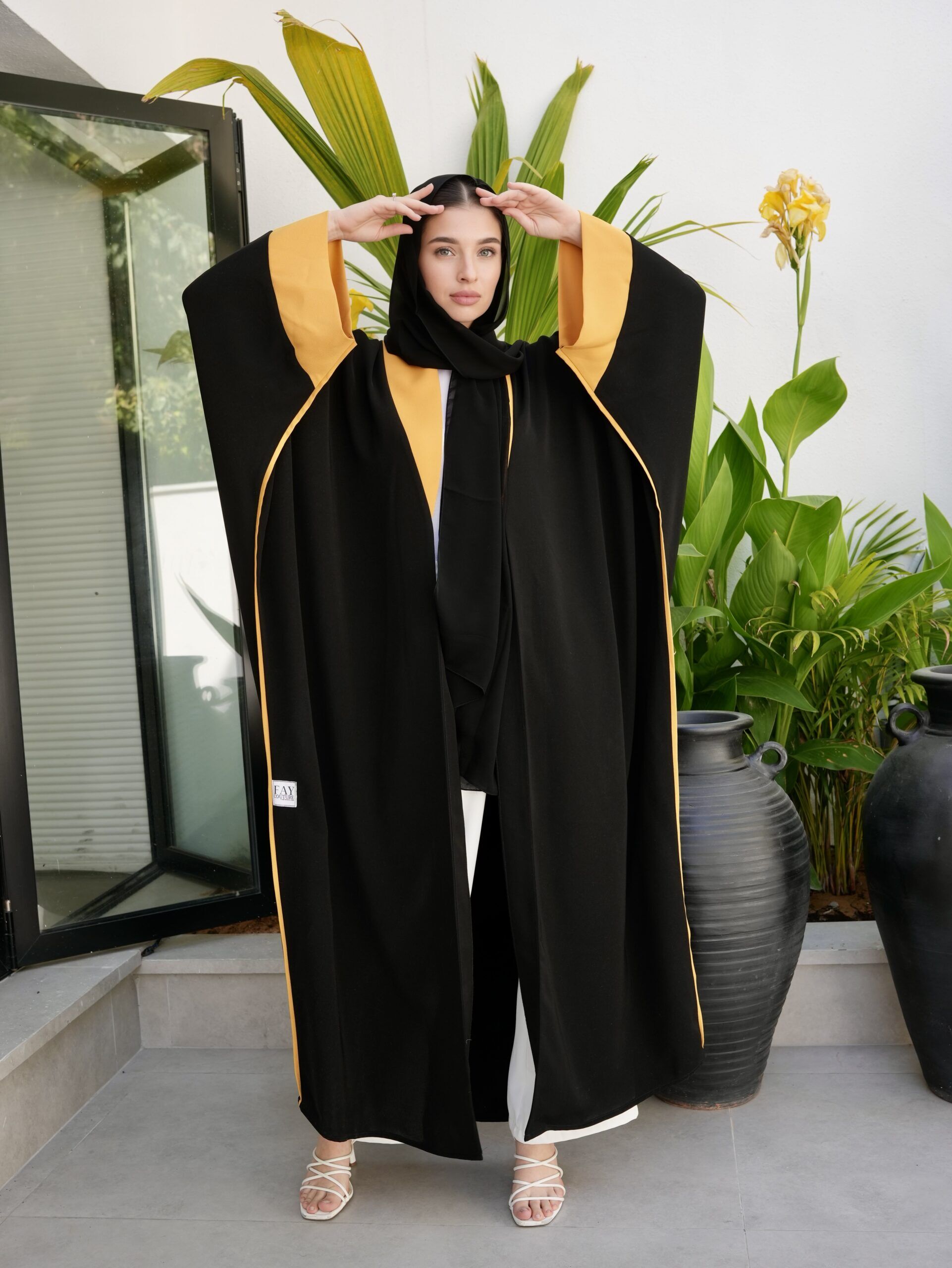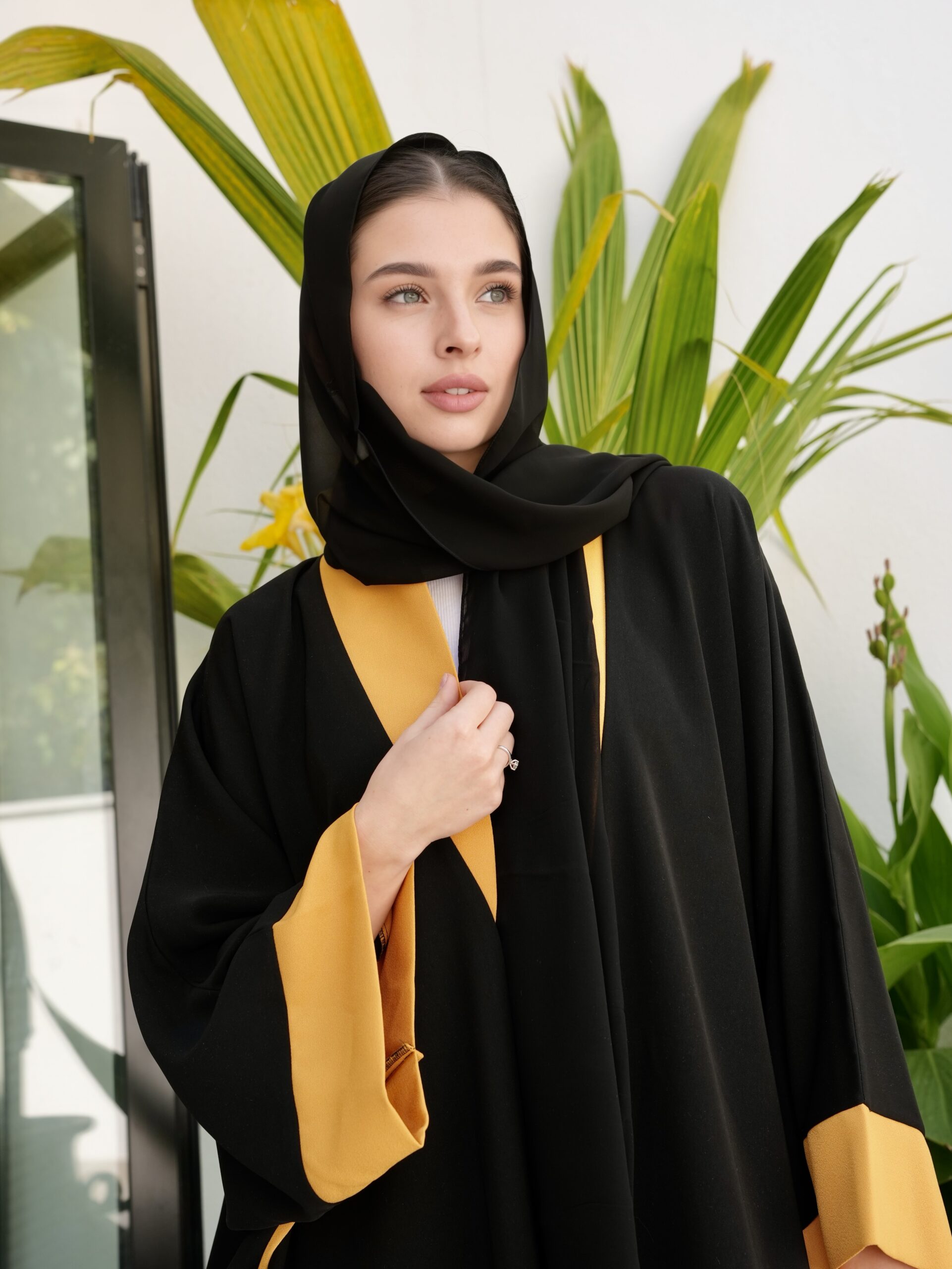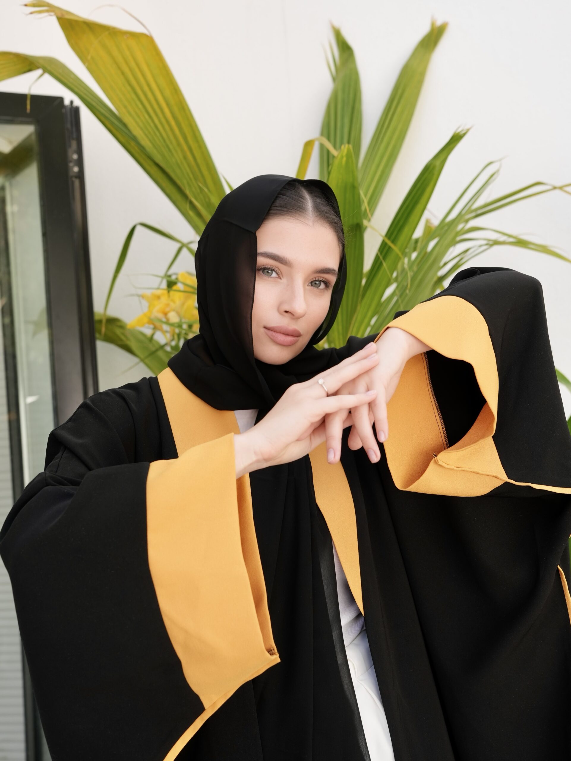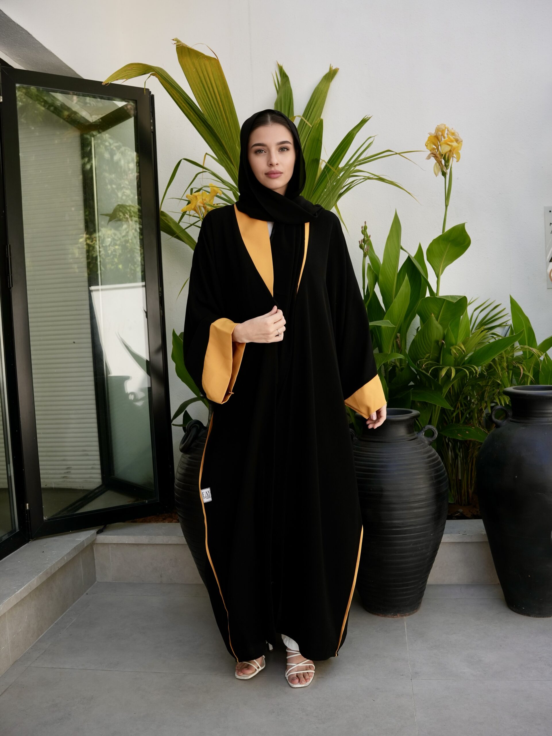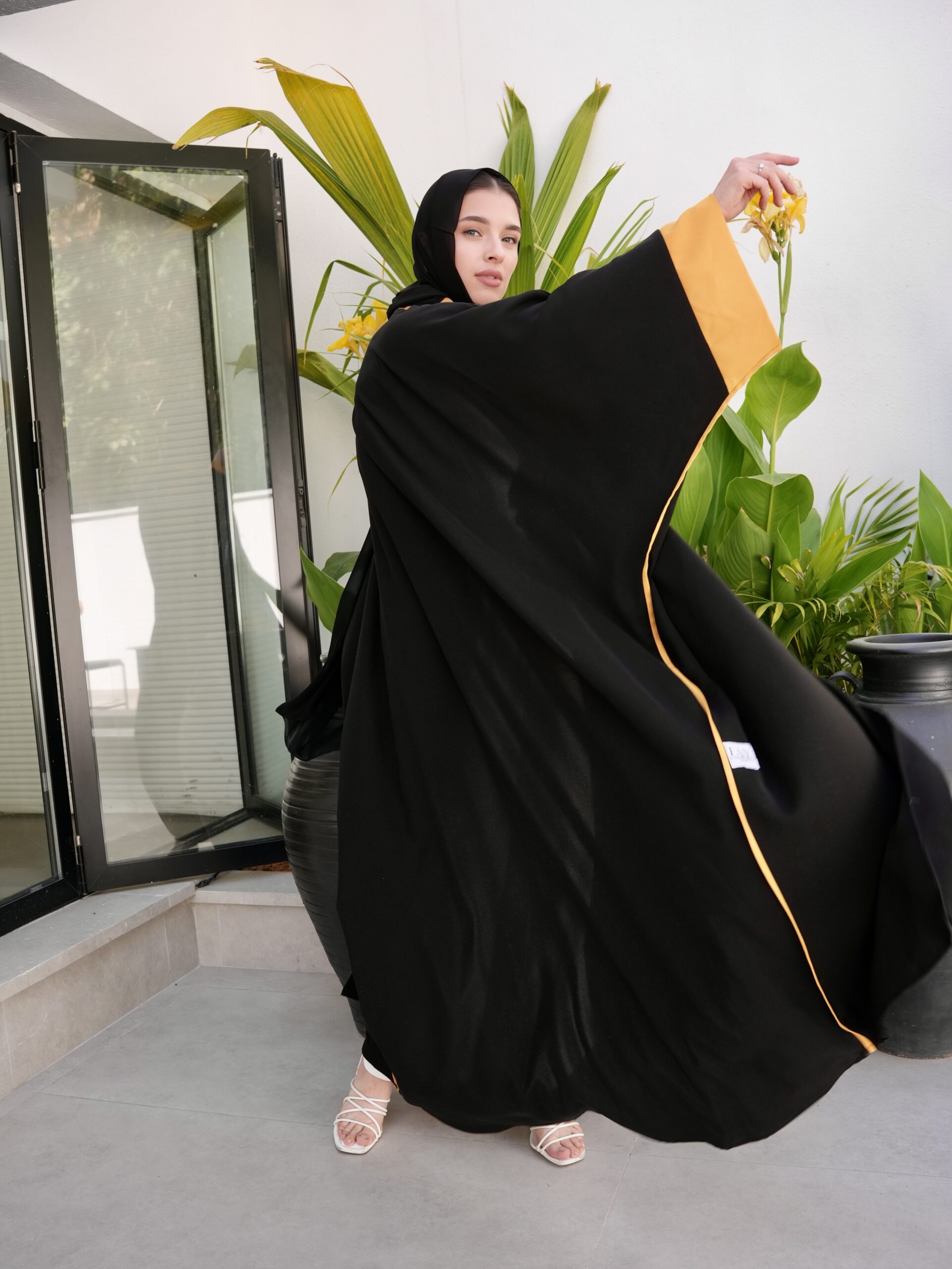 Elevate your wardrobe with “Bisht Malika,” an elegant black abaya meticulously fashioned from luxurious Neda fabric. This exquisite piece showcases a sophisticated high neck adorned in a delightful shade of orange that harmonizes seamlessly with the deep black hue. Embrace both elegance and comfort with this striking and refined abaya.